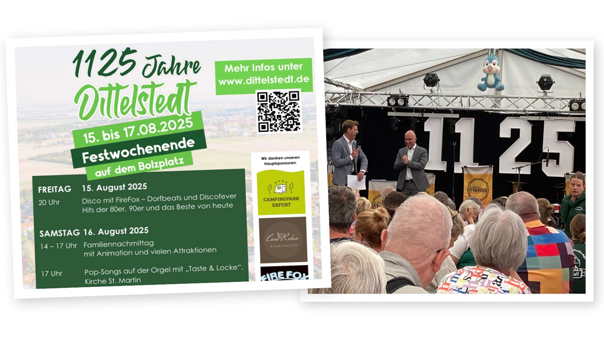 Dittelstedt hat ein ganzes Wochenende lang Geburtstag gefeiert: Vom 15. bis 17. August 2025 stand der Erfurter Ortsteil ganz im Zeichen seines 1125-jährigen Jubiläums. Das Festwochenende anlässlich der ersten urkundlichen Erwähnung im Jahr 900 n. Chr. wurde von örtlichen Vereinen, Bürgerinnen und Bürgern mit großem Engagement gestaltet.
